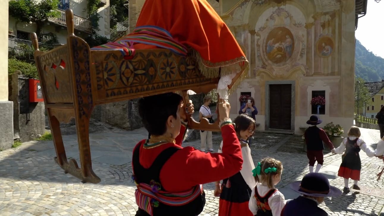 Tuttavia, ciò che si tramanda ai giorni nostri non sono solo i beni architettonici. Ogni paese della valle ha un proprio costume caratteristico che nei giorni di festa o di rievocazione viene sfoggiato con grande orgoglio, anche dai più giovani. Che sia il particolare rito del battesimo o l’appuntamento annuale con la sfilata dei costumi, i colori di un’antica tradizione vivono ancora oggi. Manuela, giovanissima residente di Fobello, mostra il suo vestito e descrive il puncetto, una trina unica nel suo genere che si crea esclusivamente qui e che impreziosisce i tessuti.